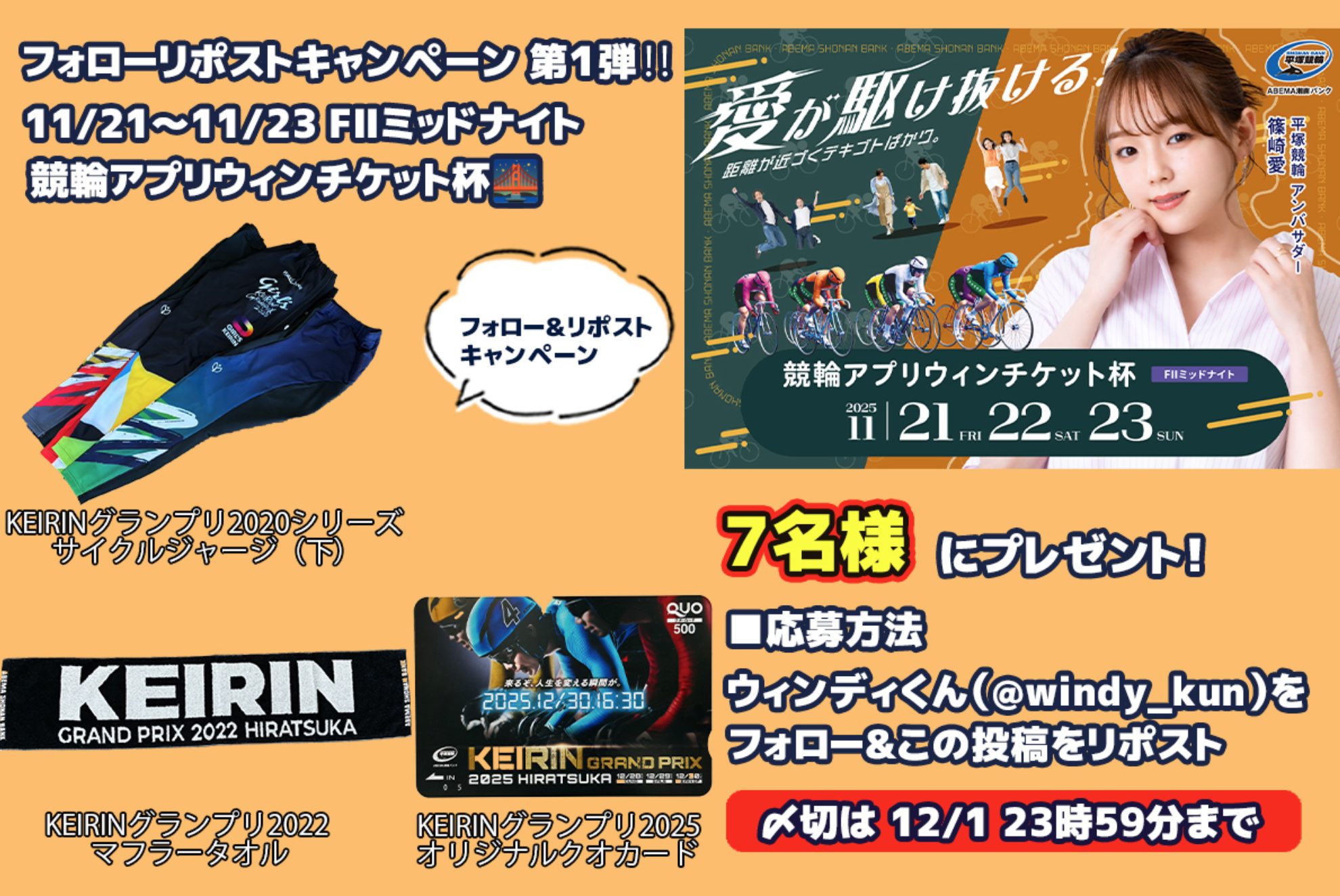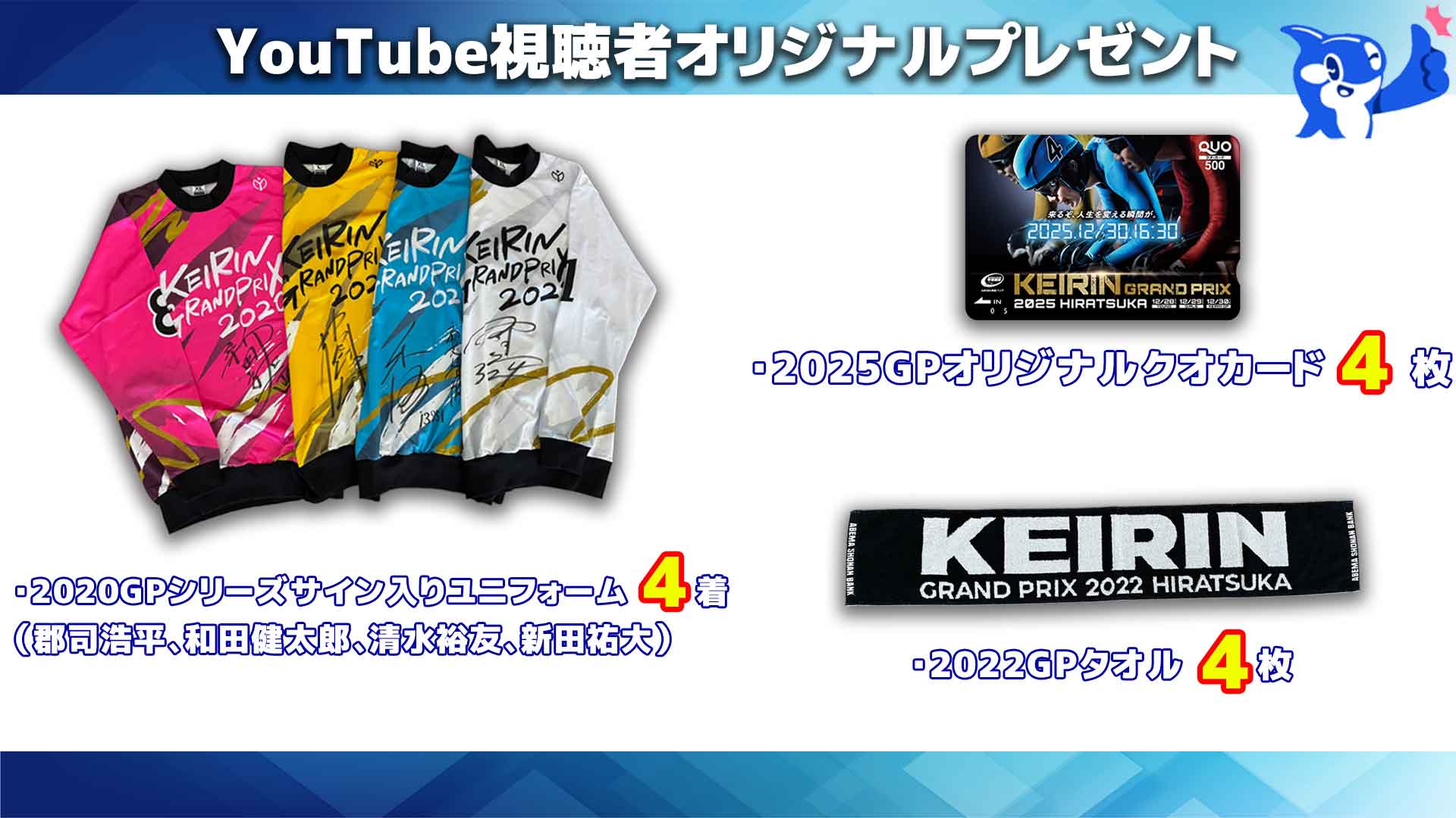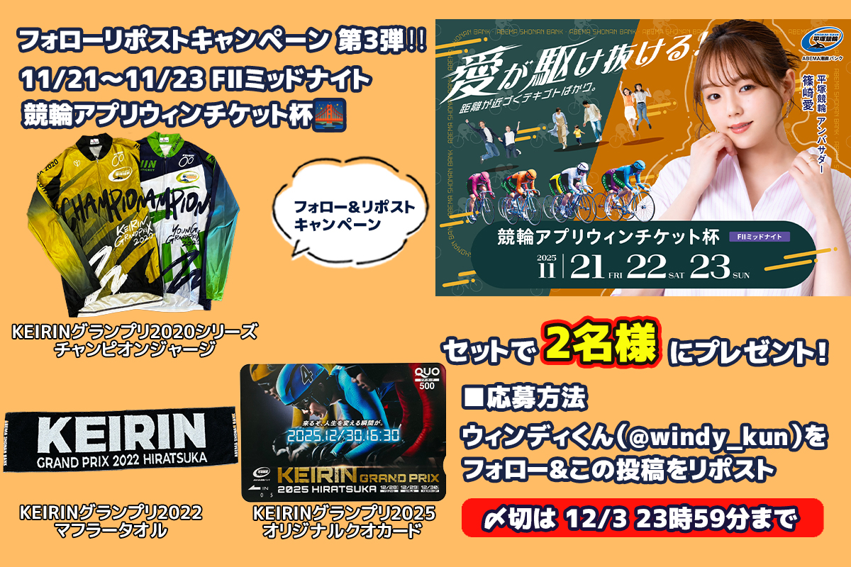 激レア✨「KEIRINグランプリ2020シリーズサイクルジャージ(下)」と「KEIRINグランプリ2022マフラータオル」と「KEIRINグランプリ2025オリジナルクオカード5️⃣0️⃣0️⃣円分」をセットで7️⃣名様にプレゼント🎁 開催中