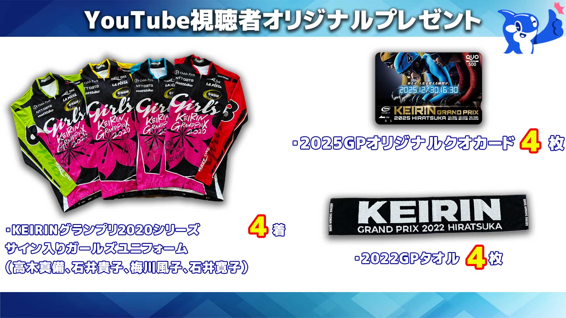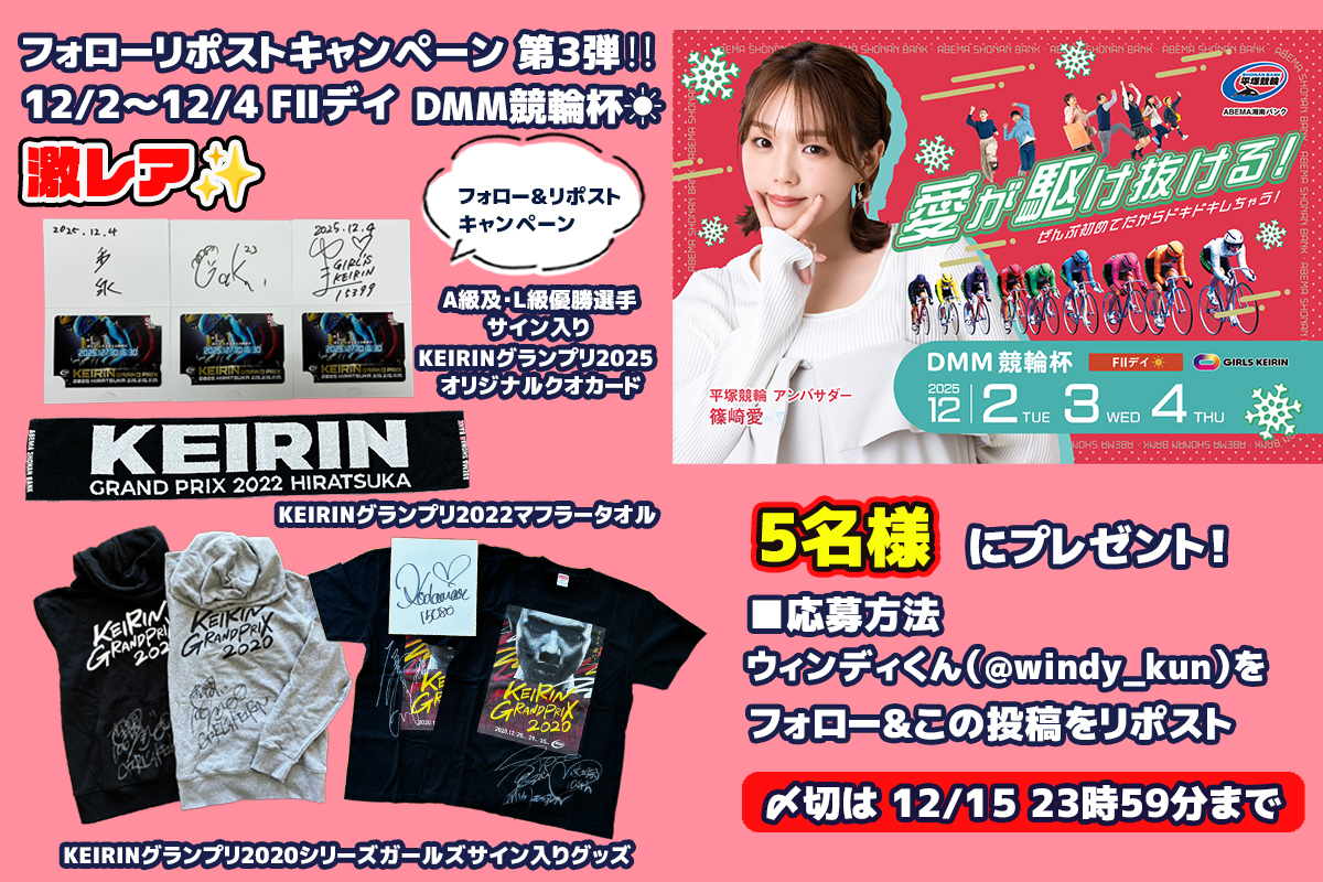 激レア✨「KEIRINグランプリ2020シリーズガールズサイン入りグッズ」と「KEIRINグランプリ2022マフラータオル」と「A級及びL級優勝選手サイン入りKEIRINグランプリ2025オリジナルクオカード1️⃣5️⃣0️⃣0️⃣円分」を抽選で5️⃣名様にプレゼント? 締切