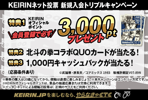 キャンペーン期間中、KNB(競輪ネットバンクサービス)に入会されたお客様に最大3つの特典が当たるチャンス! 締切